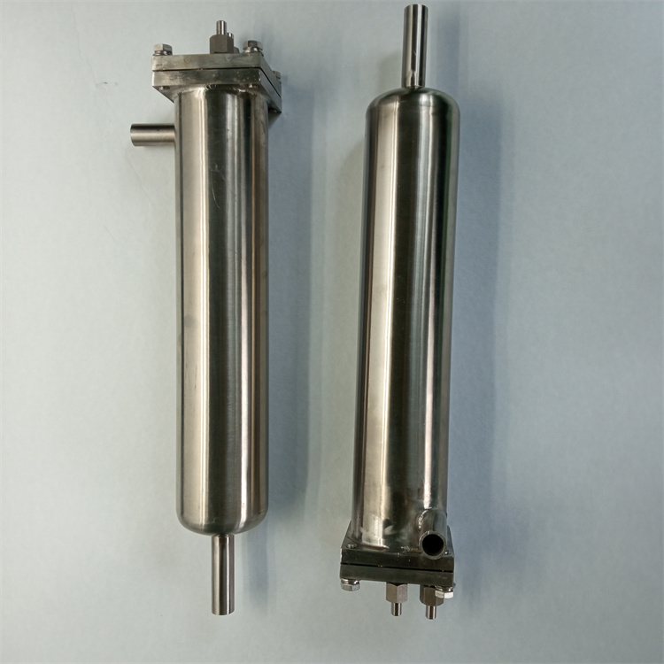 冷卻器由內螺旋管、外螺旋管組成。共同安裝在一個筒體內。外螺旋放在呈螺旋運行的冷卻水中進行熱交換;內螺旋管在呈渦流運動的冷卻水中進行熱交換,兩種冷卻水巧妙地匹配在一只冷卻器中進行流動。